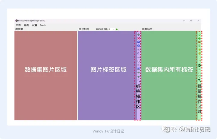 下载完后,直接双击exe文件运行,就会出现此界面。界面分为三个区域,分别是「数据集区域」「图片标签区域」「数据集内所有标签区域」。标签相关的区域右侧都有操作,可以增加、删除,翻译、上下移动标签,常用的就是这几个功能。