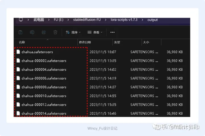 在sd/lora-scriipts-v1.7.3/output文件夹中就可以看到我们生成的LoRA模型了,因为我设置的是2步保存一个Lora模型,16步,所以有8个LoRA的阶段稿。(没有数字的这个是最后的LoRA)