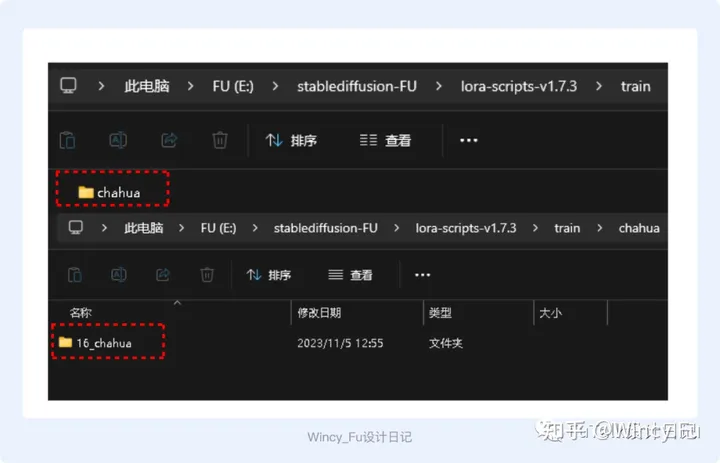 训练数据集路径:在选择这一步之前,需要现在sd/lora-scripts-v1.7.3/train这个文件夹下建一个文件夹,比如我建的叫“chahua”,再打开“chahua”文件夹在里面建一个“数字_英文名”的文件夹,将之前打标好的图和标签一起复制到“数字_英文名”的文件中(如训练chahua重复次数16,则文件夹命名为16_chahua。)