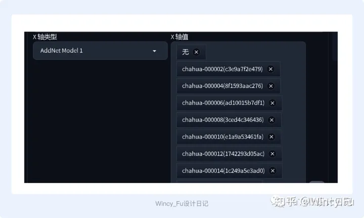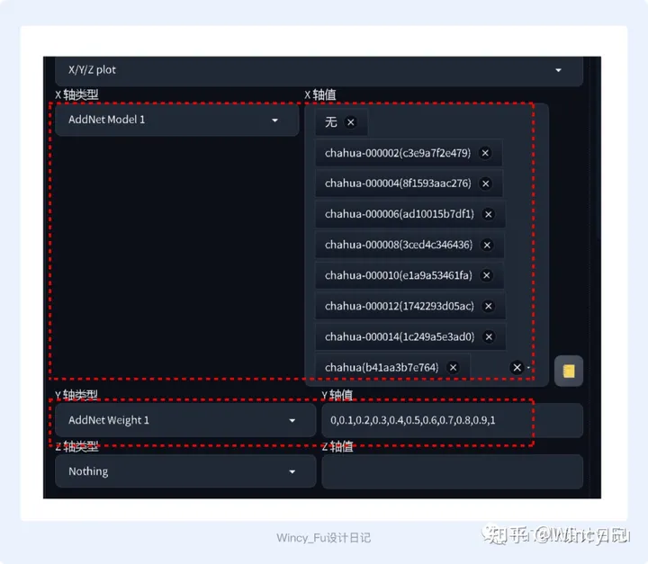 选择xyz图表,X轴类型选择附加模型1,X轴值选择生成的8个LoRA模型;Y轴类型选择附加模型权重1,Y轴值可以自行填写,我是按照从0-1的权重进行对比的。