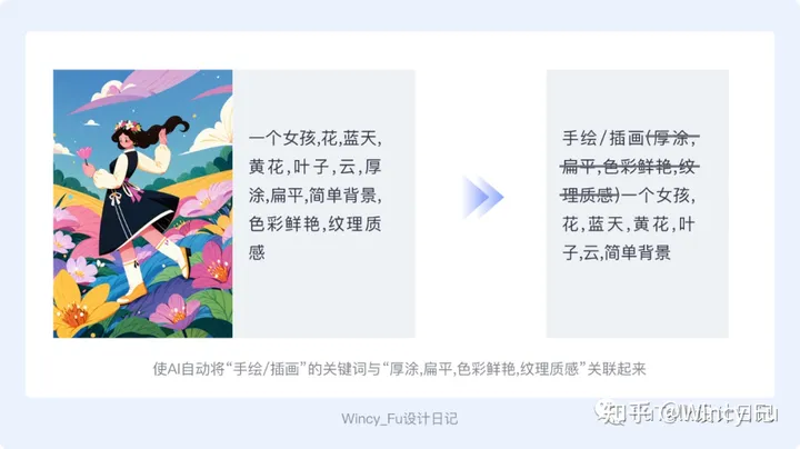 标签优化方法:删减掉训练风格或者需要生成内容的相关词。比如我要生成「手绘插画」的LoRA模型,就需要保留图片素材中手绘插画风格相关的内容作为自带特征,那么就将与手绘插画相关的词语标签删除,增加触发词“shouhui或者chahua”。将“shouhui或者chahua”触发词与其风格相关的词关联,当你填写触发词后就会自带此风格。
