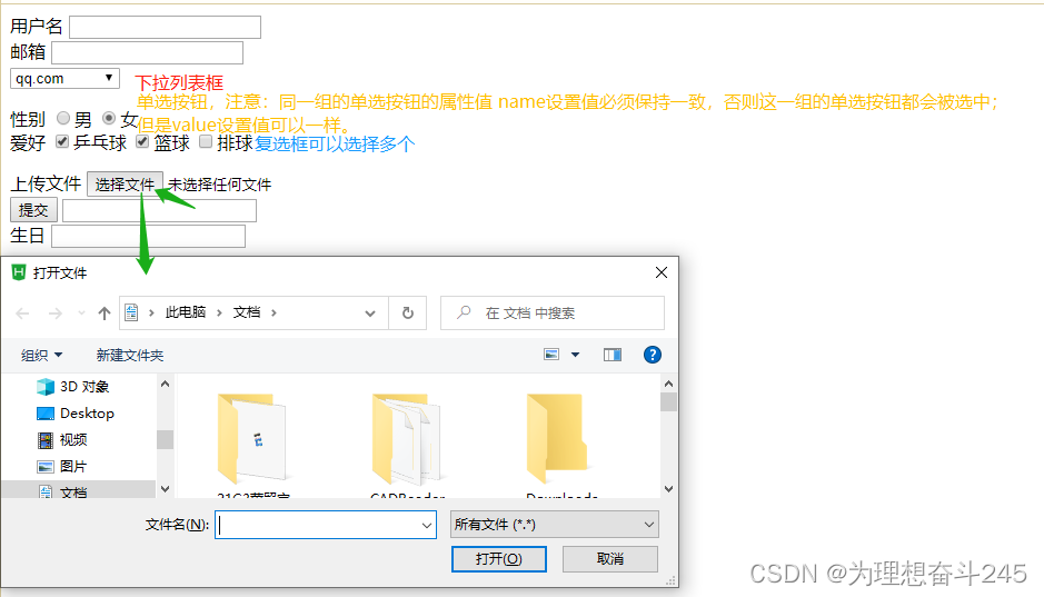 radio:单选按钮,name 和 value 是单选按钮中的必要的两个属性,必须要设置。并且同一组单选按钮中各个选项中的 name 属性值必须一样。