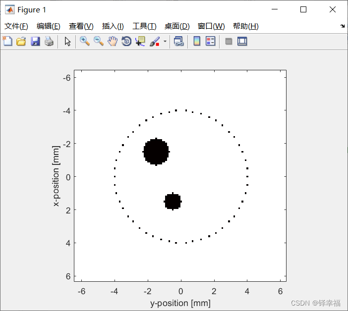 所以,所建网格的横纵坐标轴长度=128*0.1(数量*大小)=12.8[mm],所以在【Figure 1】中可以看到横纵坐标轴都为(-6.4 , 6.4)。