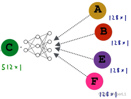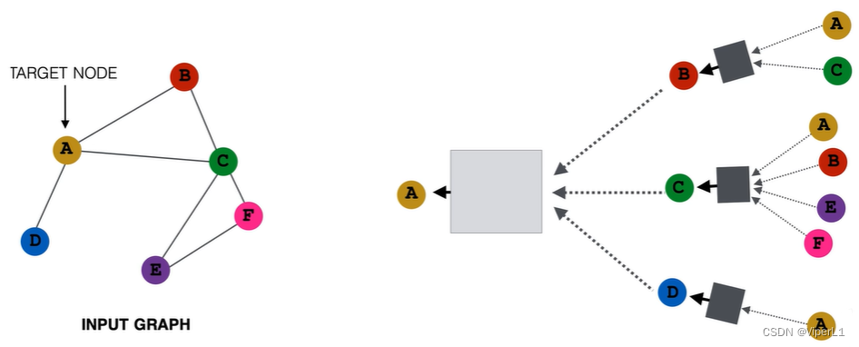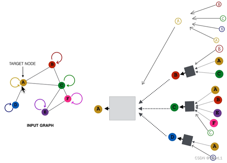 消息传递机制通过局部邻域构建计算图实现,即某个节点的属性由其邻居节点来决定。汇聚这些邻居节点信息的工作由神经网络完成,不用人为干预。其形式如下例: