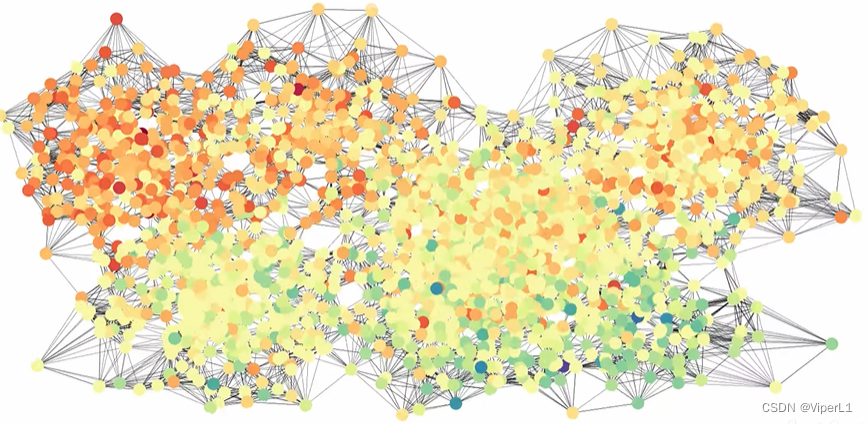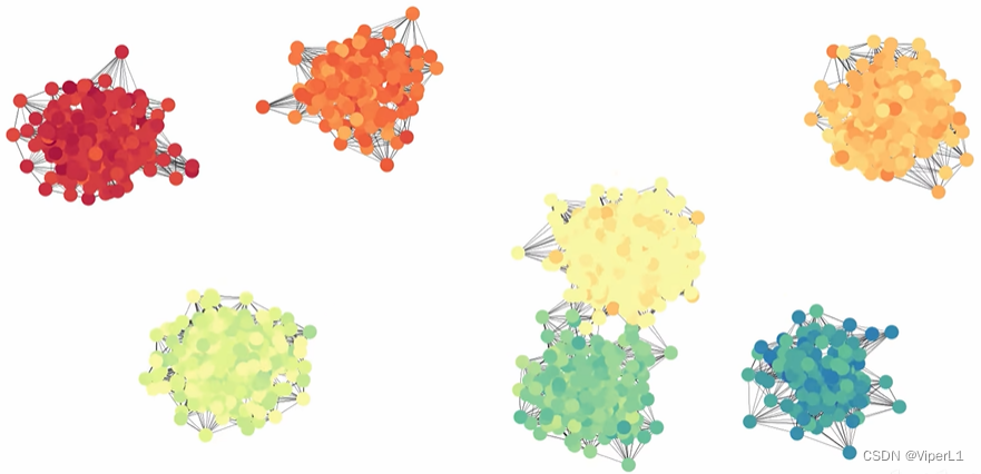 嵌入向量可以输入分类头进行分类,将其映射在二维空间上即可发现不同类别的节点在迭代中被分得越来越开。