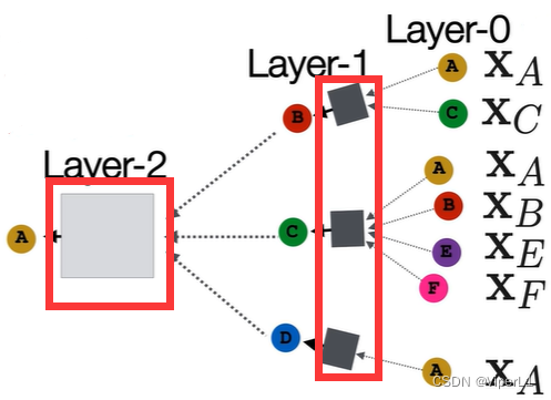 需要注意的是,图神经网络的层数并不是神经网络的层数,而是计算图的层数。图神经网络的层数=计算图的层数=图中目标节点的邻居阶数。每一层的节点共享一套计算权重。