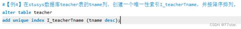 #【例4】在stusys数据库teacher表的tname列,创建一个唯一性索引I_teacherTname,并按降序排列。