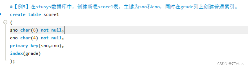 #【例5】在stusys数据库中,创建新表score1表,主键为sno和cno,同时在grade列上创建普通索引。