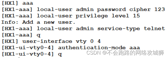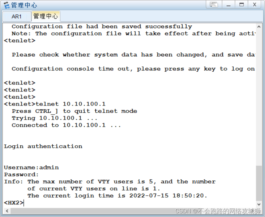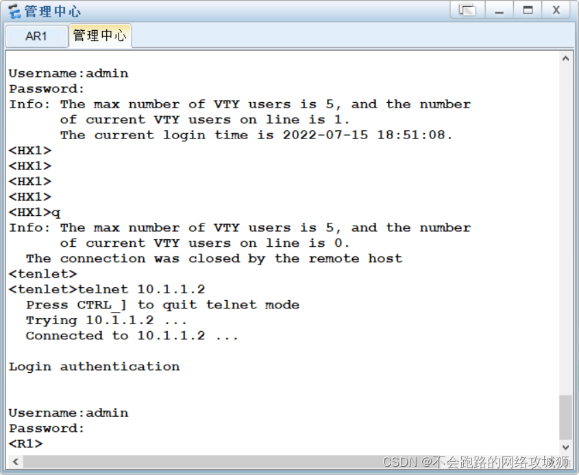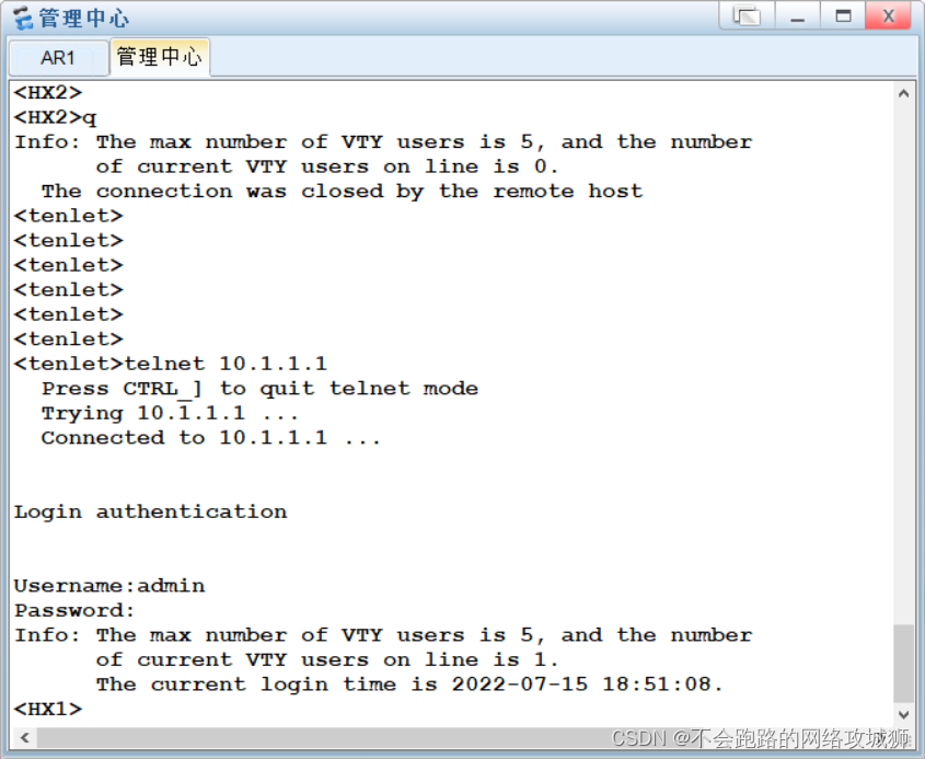 5.配置Telnet远程登录及登录认证,并实现对Telnet的控制(只允许管理路由器登录)