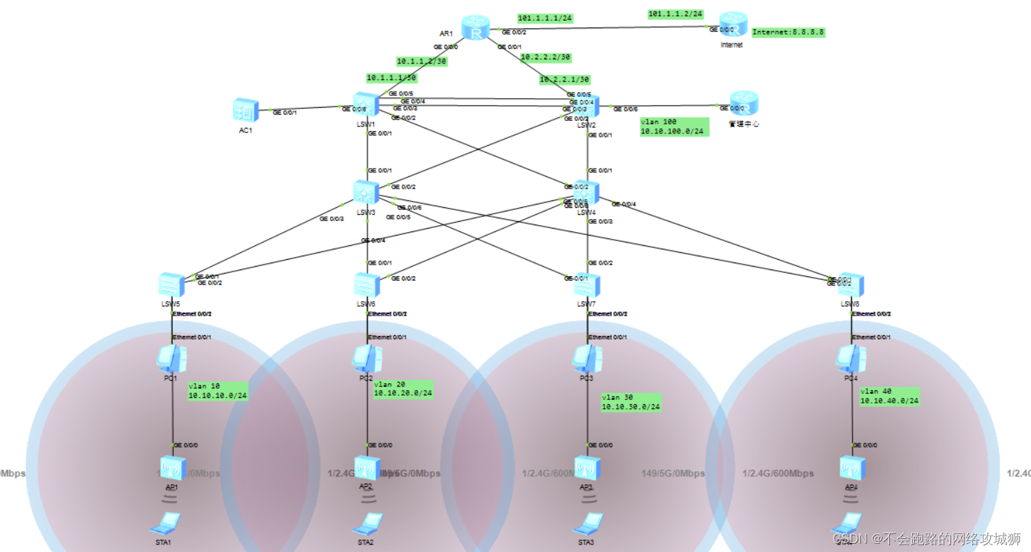 文章简介:本文用华为ensp对企业网络进行了网络规划和无线模拟等场景,文章附完整设备配置命令。附件为ensp项目,如有需要可下载后联系作者,提供售后服务,可以根据定制化需求做修改