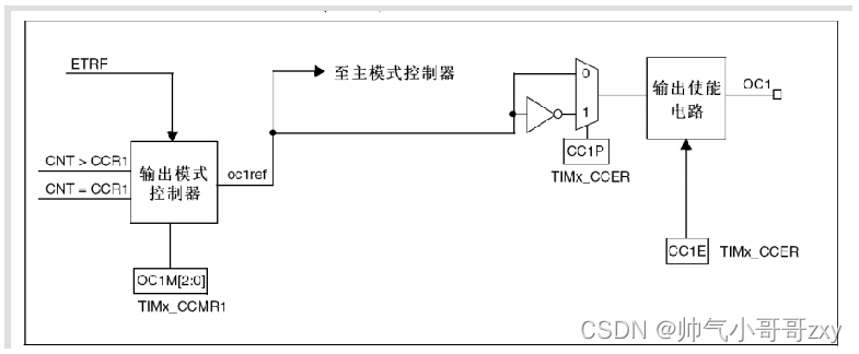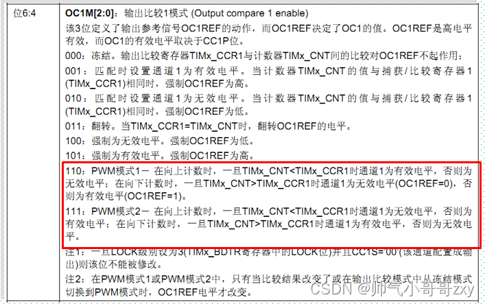 寄存器TIMx_CCMR1的OC1M[2:0]位来分析: