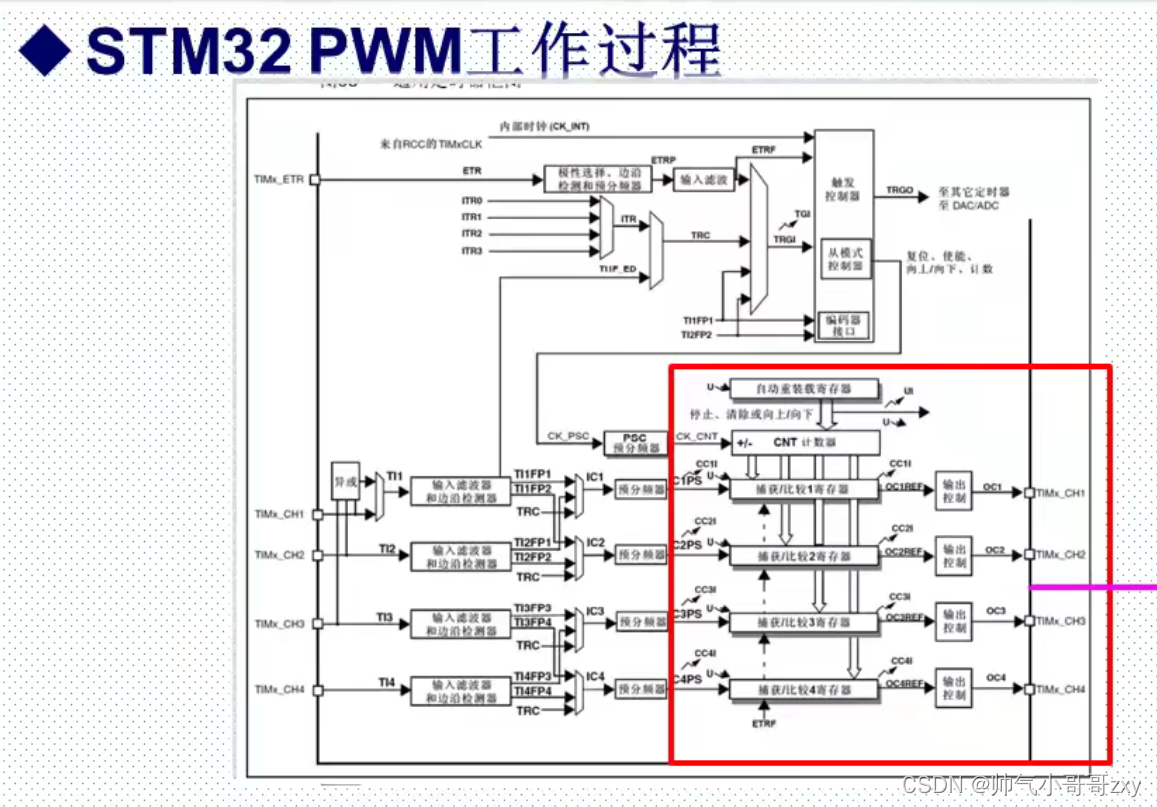 在定时器的时机部分,它的时钟是默认的内部时钟,产生时钟信号,提供给我们的定时器,定时记步器给他作为时钟,这里有PWM输出单元