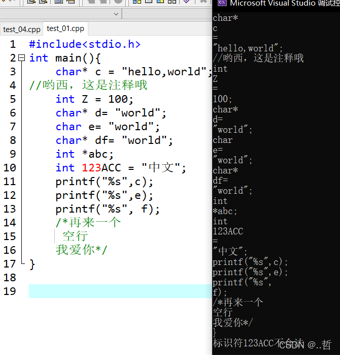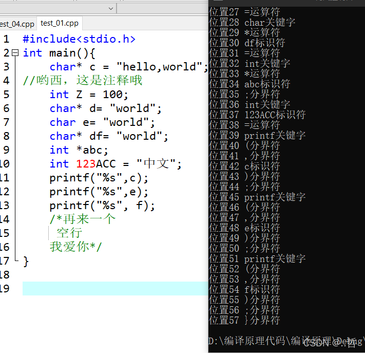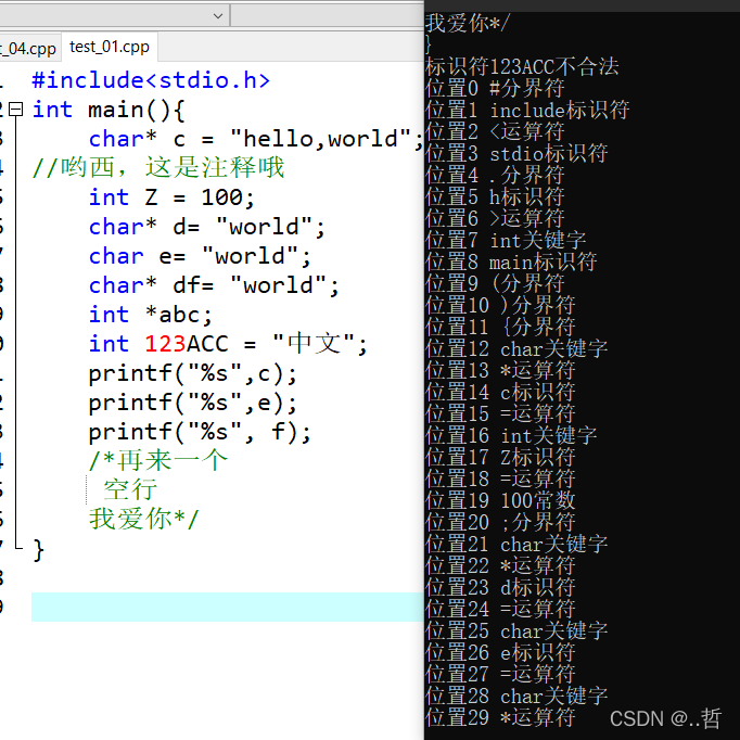 包含多行注释。图一是程序读取到的源文件内容(分割后)。可以看到图二图三中,将单行注释和多行注释都去除了。
