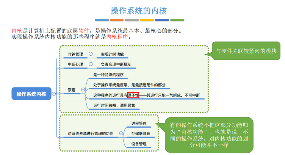 在具体实现上,将CPU的运行模式划分为用户态(目态)和核心态(又称管态、内核态)。处于用户态时,说明正在运行的是应用程序,此时只能执行非特权指令;处于内核态时,说明此时正在运行的是内核程序,此时可以执行特权指令。