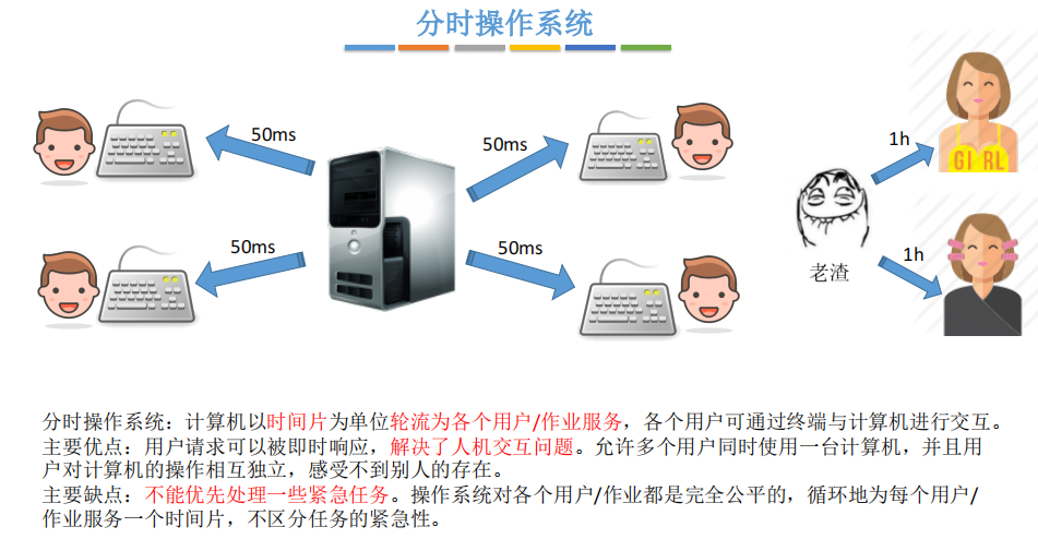 所谓分时技术,是指把处理器的运行时间分成很短的时间片,按时间片轮流把处理器分给各联机作业使用。若某个作业在分配给它的时间片内不能完成计算,则该作业暂时停止运行,把处理器让给其他作业使用,等待下一轮再继续运行。