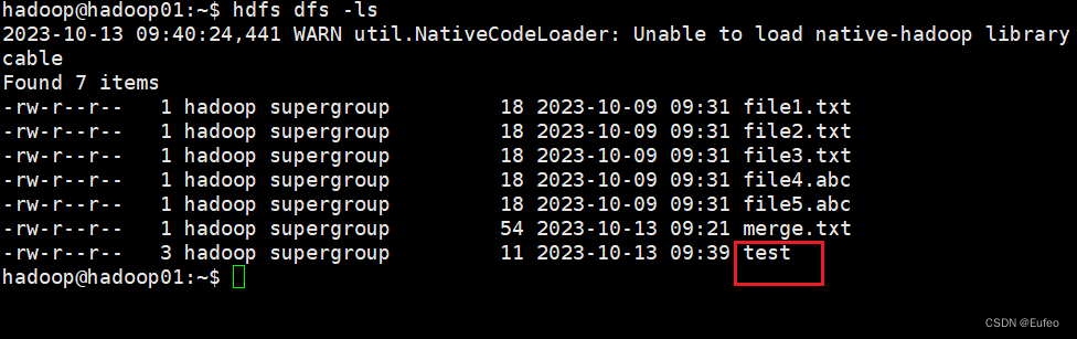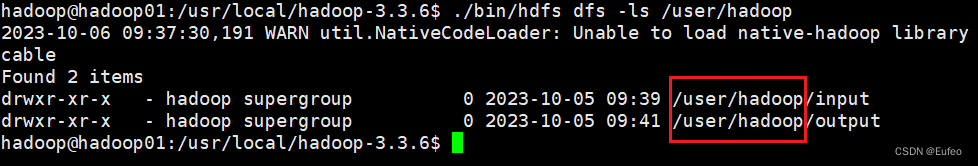 hdfs dfs -ls # 查看/user/hadoop 目录下有哪些文件夹