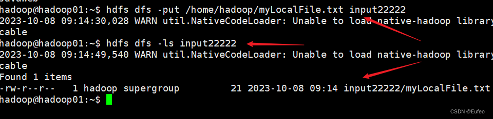 hdfs dfs -put /home/hadoop/myLocalFile.txt input22222 # 设置了PATH变量的话可以直接使用hdfs命令