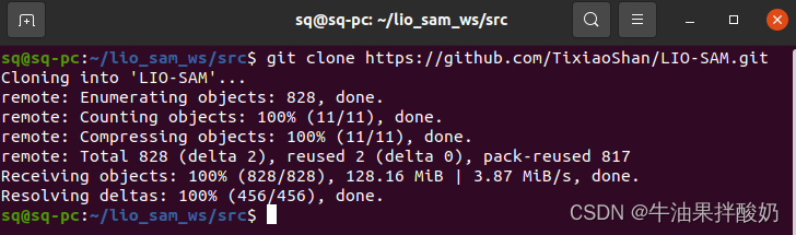 继续在此终端中执行以下命令,将会从github官网上克隆LIO-SAM的源码包,这个过程会受网络的影响。
