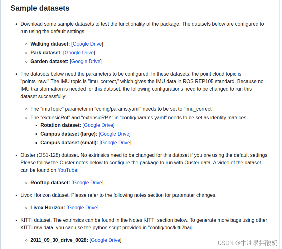 同样是访问这个网站https://github.com/TixiaoShan/LIO-SAM,在这个网站下面有数据包的链接,您可以点击链接进行下载,如下图所示,前三个链接的数据包甚至都不用您修改LIO_SAM任何参数就能使用。