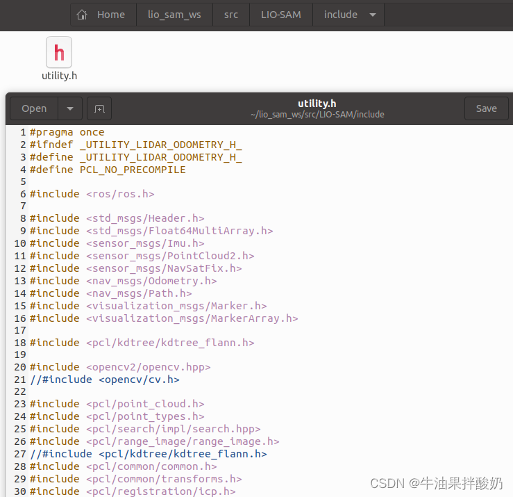第二处位于lio_sam_ws/src/LIO-SAM/include目录下,双击打开utility.h文件,请将第18行的#include <opencv/cv.h>使用//注释掉,并添加以下内容,保存后退出,添加后如下图所示: