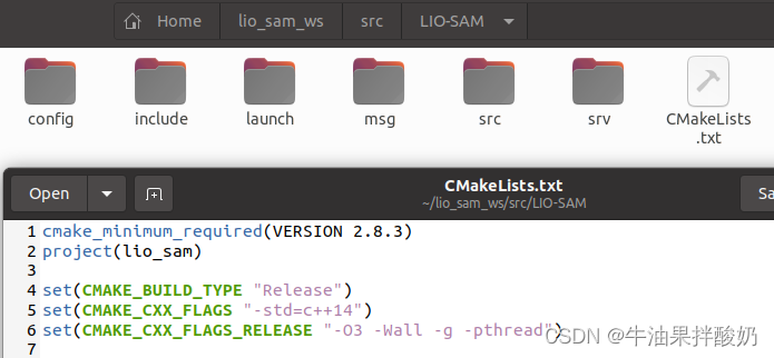 第一处位于lio_sam_ws/src/LIO-SAM目录下,双击打开CMakeLists.txt文件,请将第5行的c++11改为c++14,保存后退出,如下图所示: