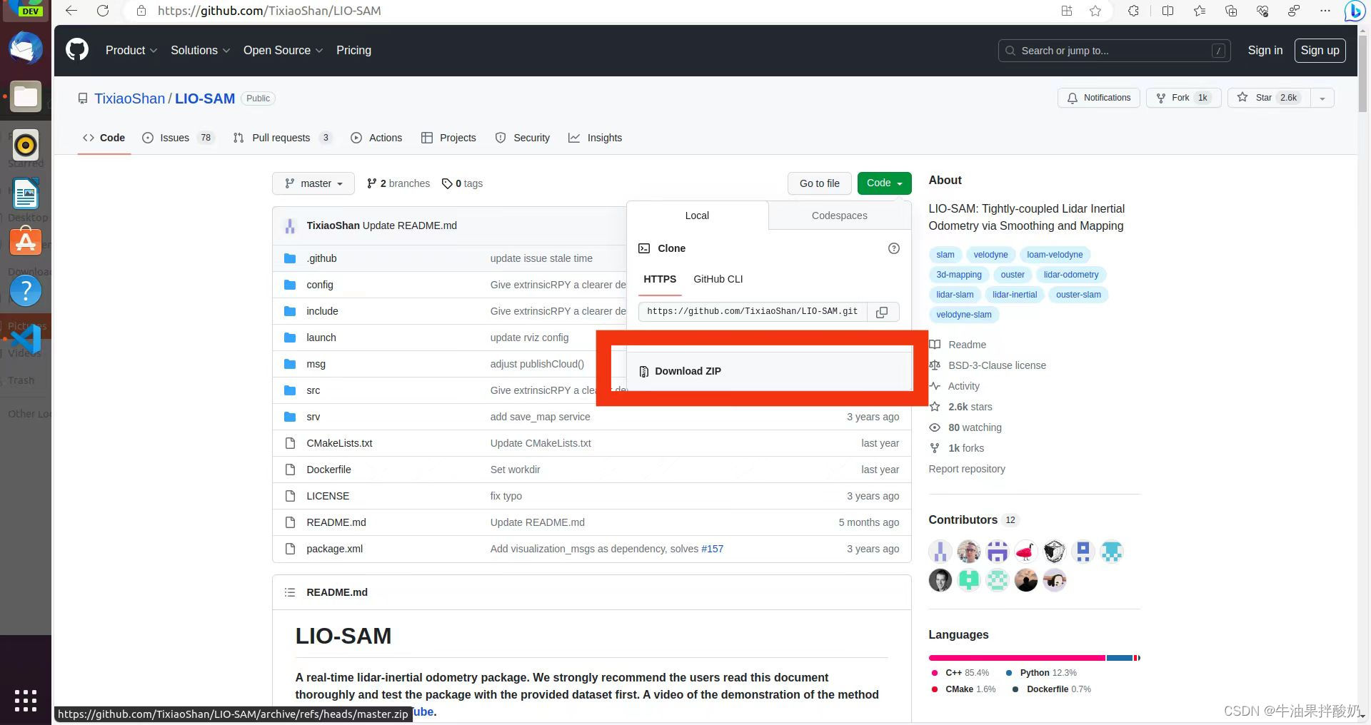 注意: 和上图一样的结果,请跳过这里。如果尝试多次都没有克隆成功,请访问这个网址https://github.com/TixiaoShan/LIO-SAM,在这个页面中点击Code,并点击下载zip文件,此文件下载完成后默认放在用户目录的Downloads文件夹中。先解压此文件,解压后的文件名为LIO-SAM-master,请改名为LIO-SAM后,把LIO-SAM剪切到刚创建的的src文件夹下。