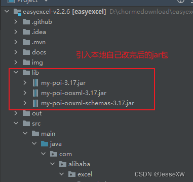 自己去github把easyexcel的源码down下来,这一步应该就不用我多做了吧......然后修改pom中对应的原有的依赖,引入本地jar。