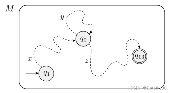 我们从该正则语言中选取一个长度为 (pumping length, 可理解为等价DFA的状态个数)的字符串s,且s可以被分成x,y,z三部分(