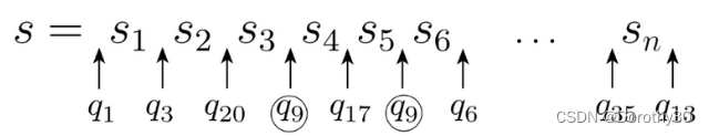 在DFA 的单状态性下,每读取一个字符,状态就会进行对应的转换,因此s的p个字符在状态机中应该要移动p次,需要p+1个状态。但是因为状态机M只有p个状态(状态之间的连线只有p-1条),根据鸽巢原理,肯定至少有两次移动在同一个状态上进行(成环)。我们可以假定这个状态为, 如下图,