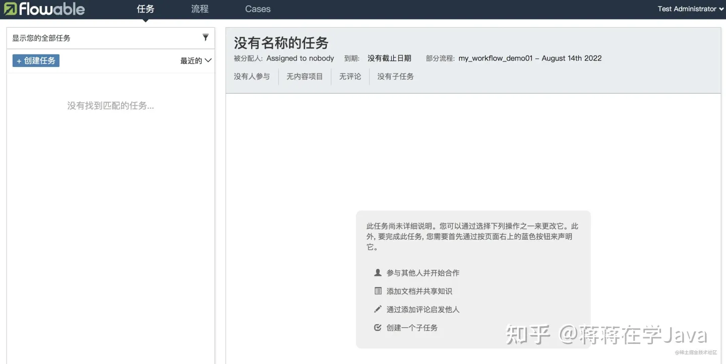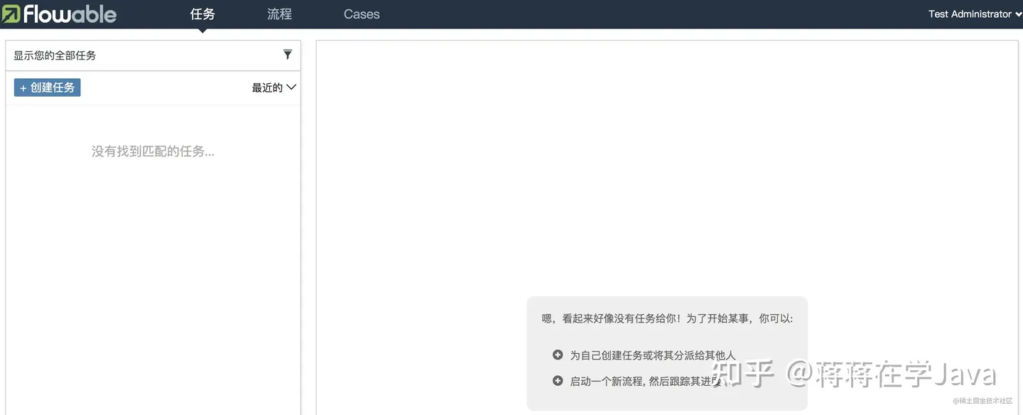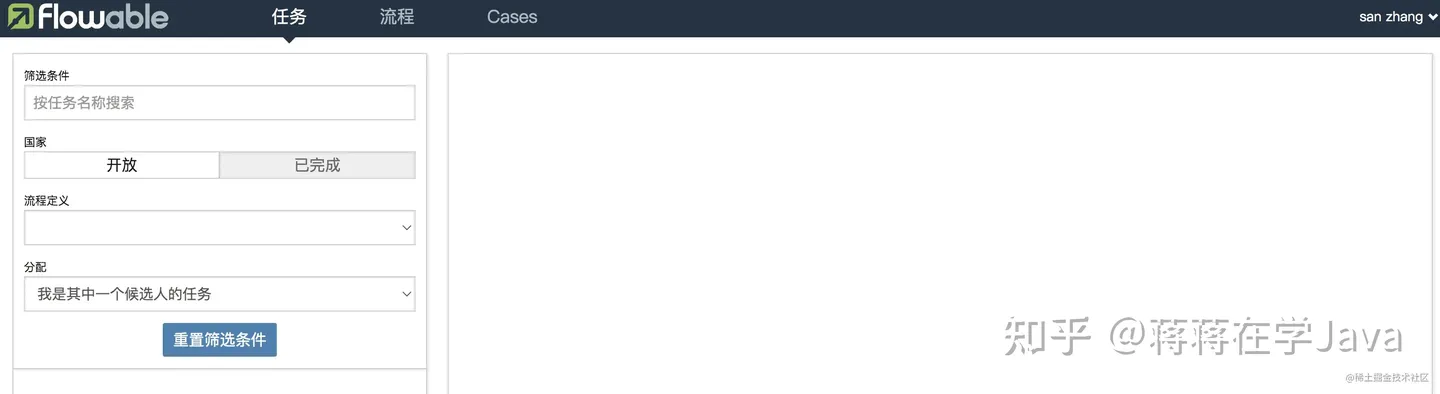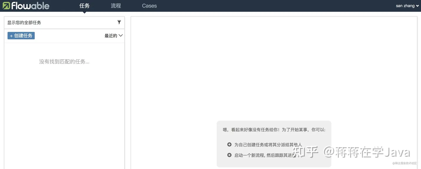 这是因为当前用户是 admin,而我们流程中第一个 UserTask 应该是由组长来处理的,所以我们现在注销登录,先以 zhangsan 的身份登录,因为 zhangsan 的角色是经理,所以他登录上来应该也是没有任务的: