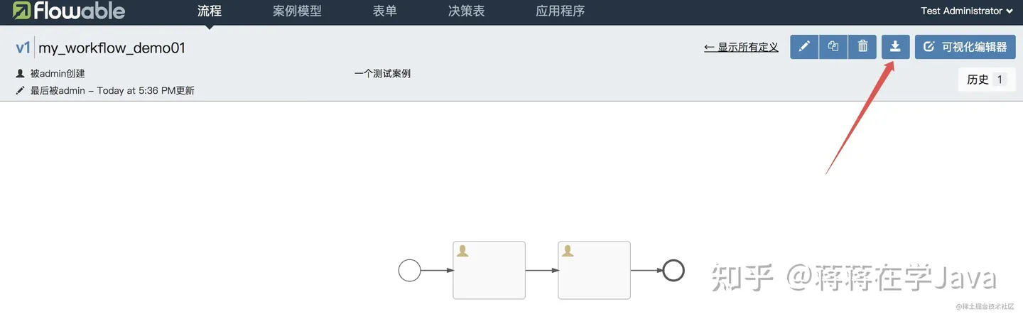 点击流程图就可以查看流程图的详情,点击右上角的下载按钮,就可以下载这个流程图对应的 XML 文件了,将 XML 文件拷贝到我们的项目中,就可以开始开发啦。