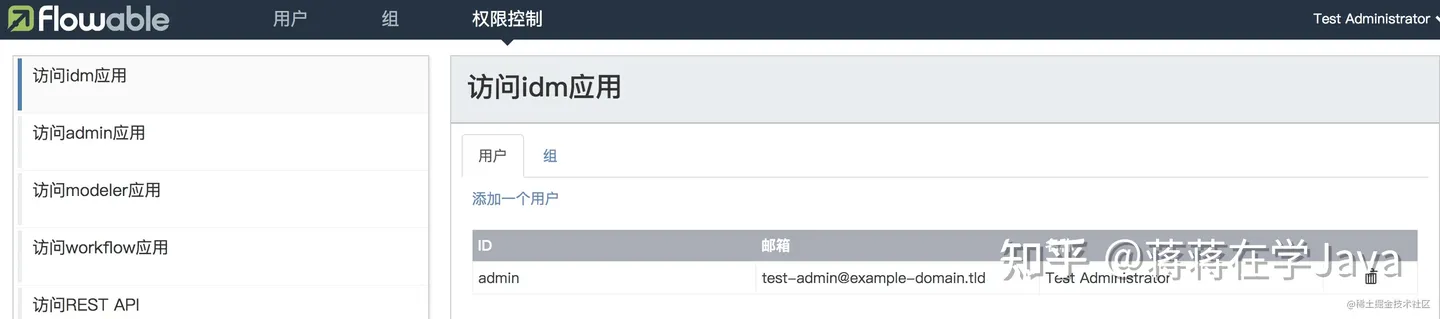 - Flowable IDM: 身份管理应用。为所有 Flowable UI 应用提供单点登录认证功能,并且为拥有 IDM 管理员权限的用户提供了管理用户、组与权限的功能。