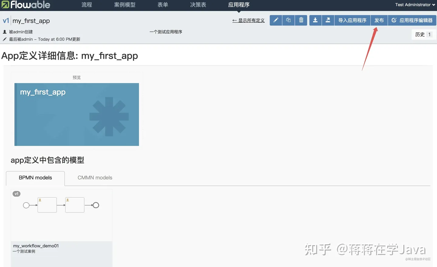 点进到这个应用程序中,点击右上角的发布按钮,可以发布该应用程序。