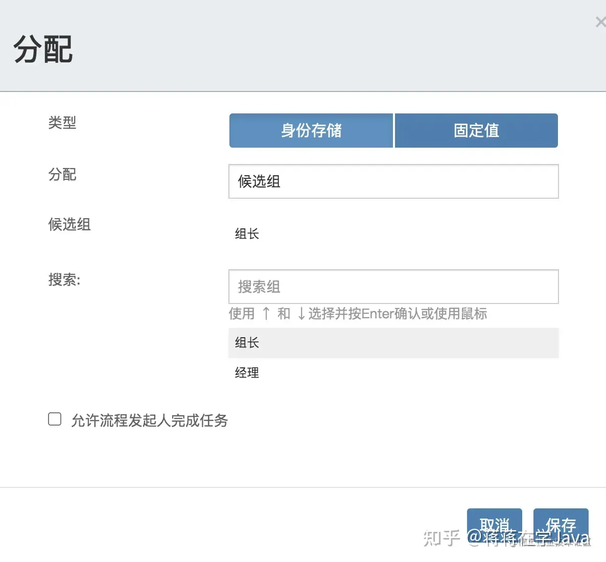大家看到有四种不同的用户选项,我这里选择候选组,也就是将来由指定的用户组中的用户来处理这一个任务: