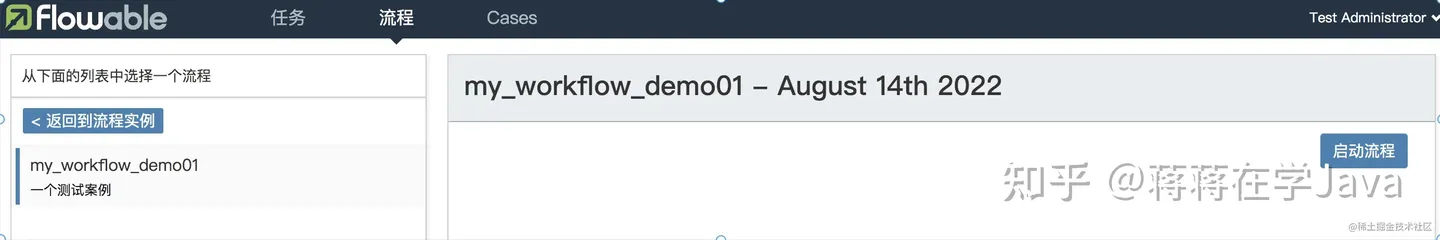 点击启动流程按钮之后,左边会展示出来所有的流程实例,我们现在只有一个发布的流程,所以选中该流程,点击右边的启动流程按钮: