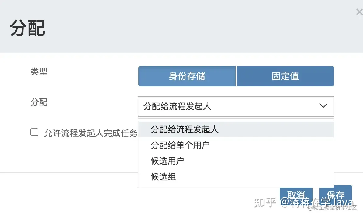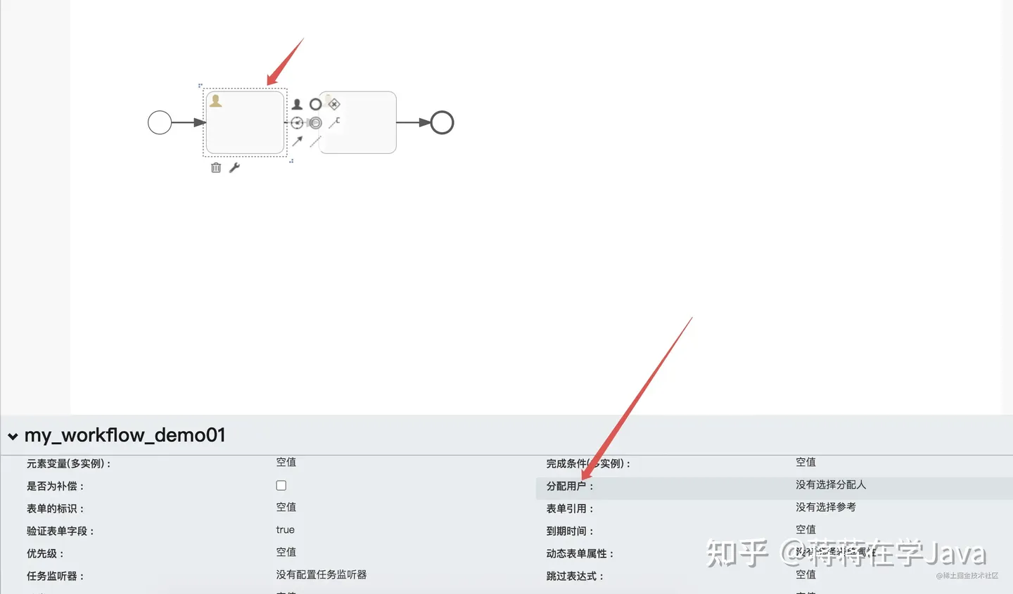 选中第一个 UserTask 之后,然后在下方找到分配用户,设置任务分配人: