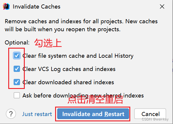 还是不行的话,就重启大法吧:清空 idea 缓存并重启(具体见下图操作),重启电脑。