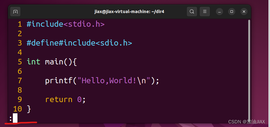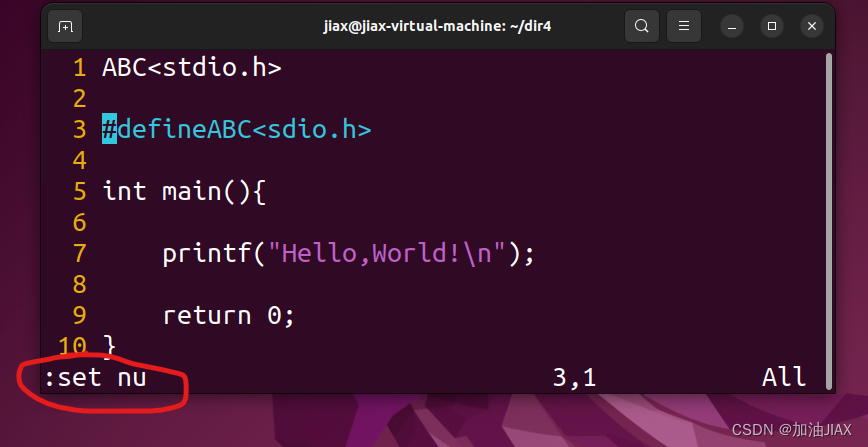 6.进入一个文件中,进入末行模式 : ,输入 set nu,完成行号设置。