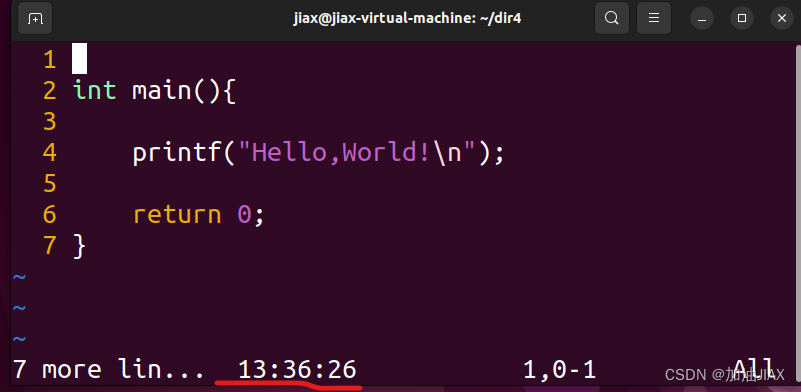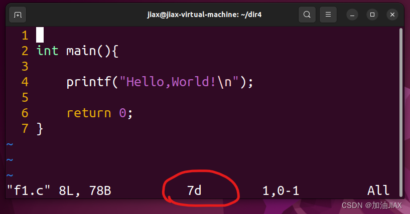 此时文件光标在第一行,输入 7d 后,终端底部出现 7d,再输入一个d,系统就解析输入的7dd为删除命令,删除包括第一行在内的总共7行文件内容。