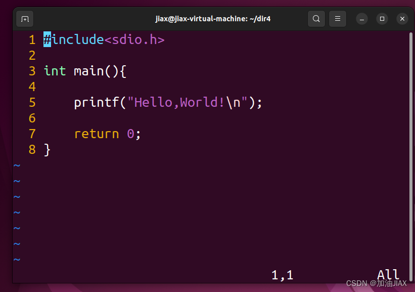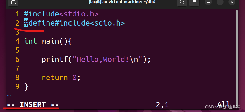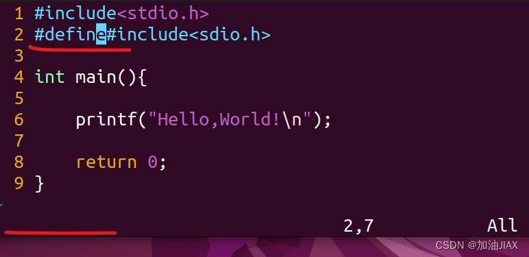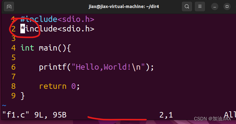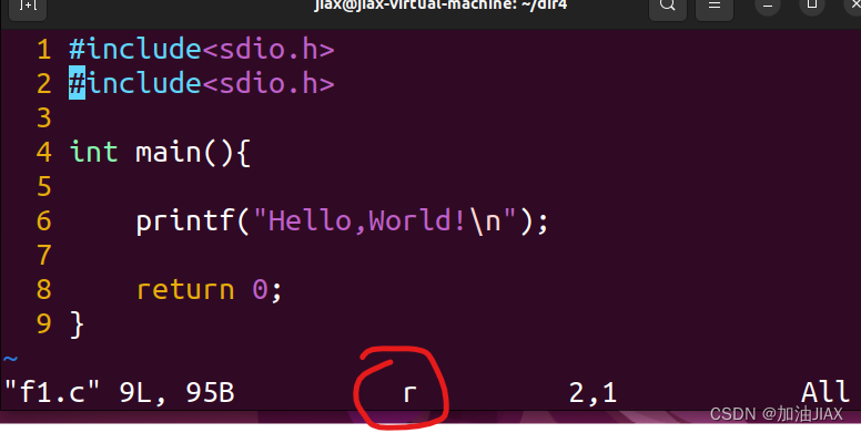 例如,此时光标在f1.c文件的第二行第一个字符位置,按下 r 键后,终端底部出现 r ,再点击一下 * ,就可以将 # 替换为 * 。