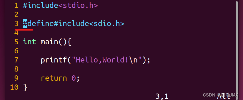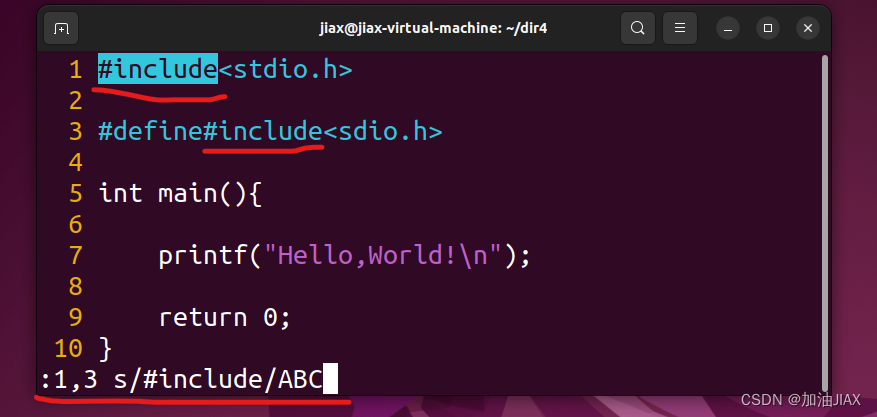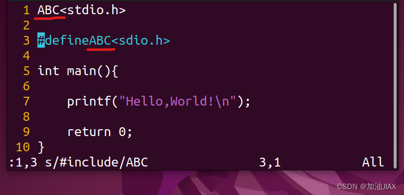 例如,此时,使用命令 1,3 s/#include/ABC ,将文件中1到3行的 #include 替换为 ABC 。