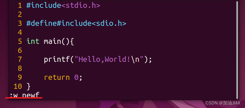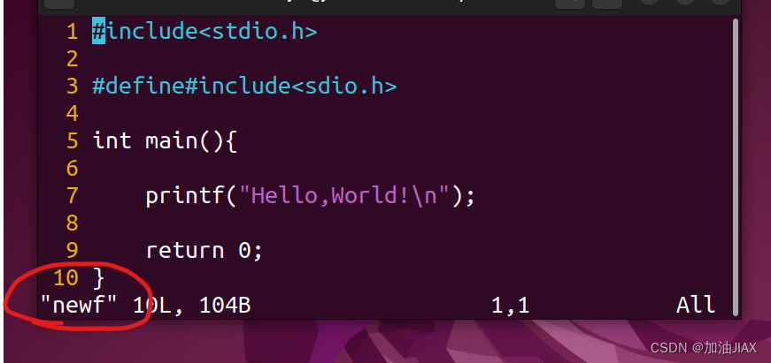 另存成功后,终端底部显示如图提醒,并且在退出后查看当前目录出现了一个新文件newf。打开后其内容与 文件f1.c 相同。
