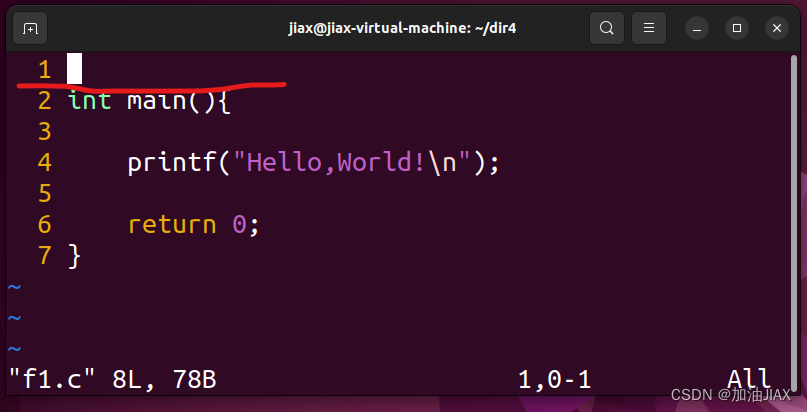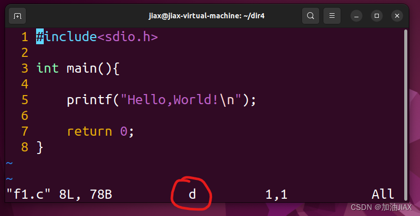 1.1、dd(字母d连按两次):将光标所在行文件内容删除