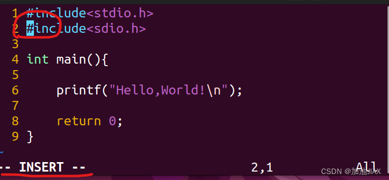 例如,此时光标在第二行第一个字符位置,点击 i 键后,终端底部出现 -- INSERT --字样。此时,就可以开始在当前位置进行编辑内容,若添加数据,则当前位置及该行以后的原内容向后移动。