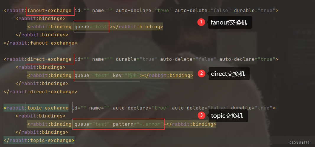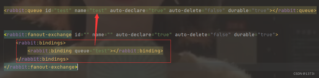 <rabbit:fanout-exchange id="" name="" auto-declare="true" auto-delete="false" durable="true"> <rabbit:bindings> <rabbit:binding queue="test"></rabbit:binding> </rabbit:bindings> </rabbit:fanout-exchange>queue 表示绑定的队列名成