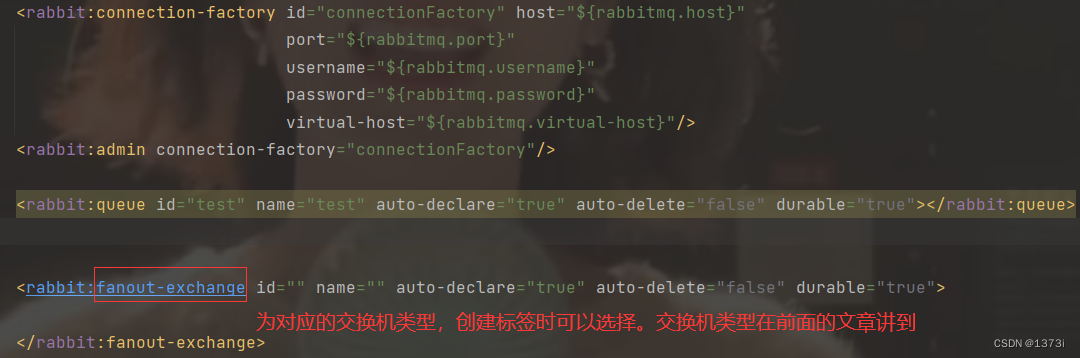 同样在生产者项目里我们之前创建的xml文件里同样我们也可以一个标签去创建交换机以及绑定队列