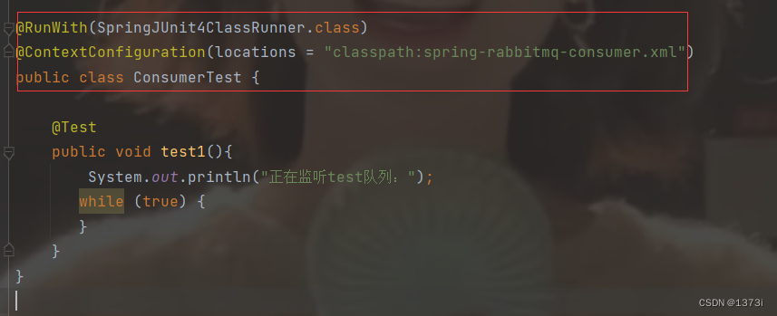然后创建一个测试类,与生产者相同加两个 注解,然后在测试方法里死循环的去监听队列