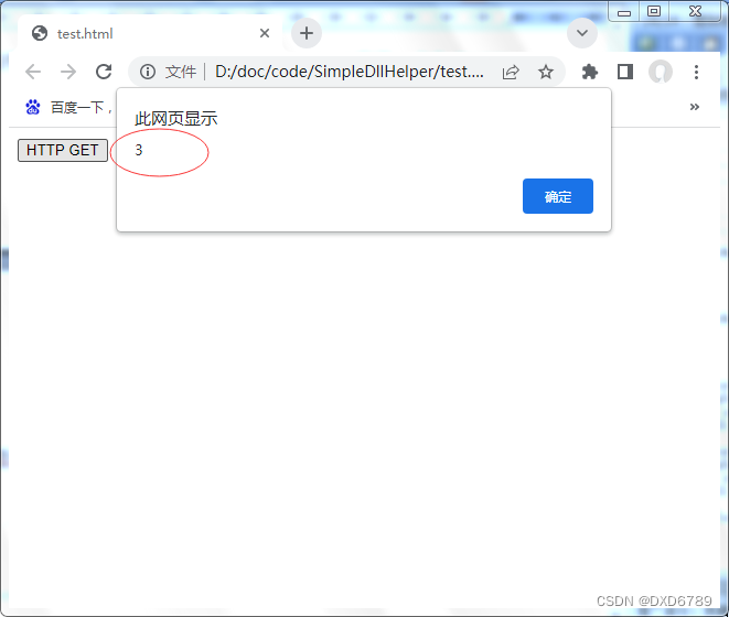 最后我们在浏览器中打开前面写的test.html文件,点击“HTTP GET”按钮,将会看到和java助手程序一样的结果