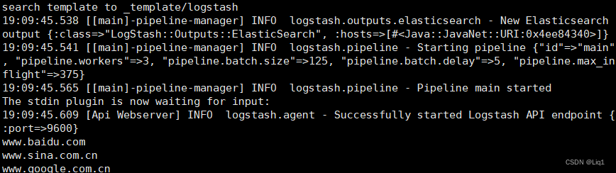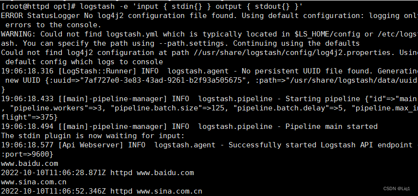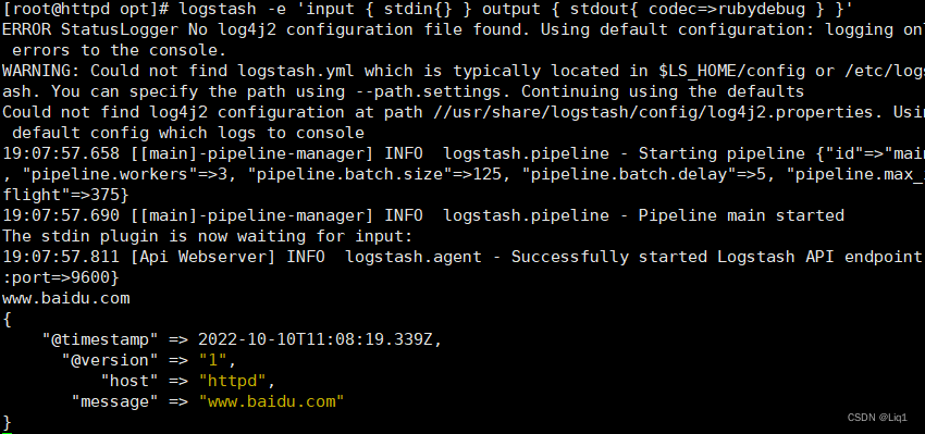 logstash -e ‘input { stdin{} } output { stdout{} }’